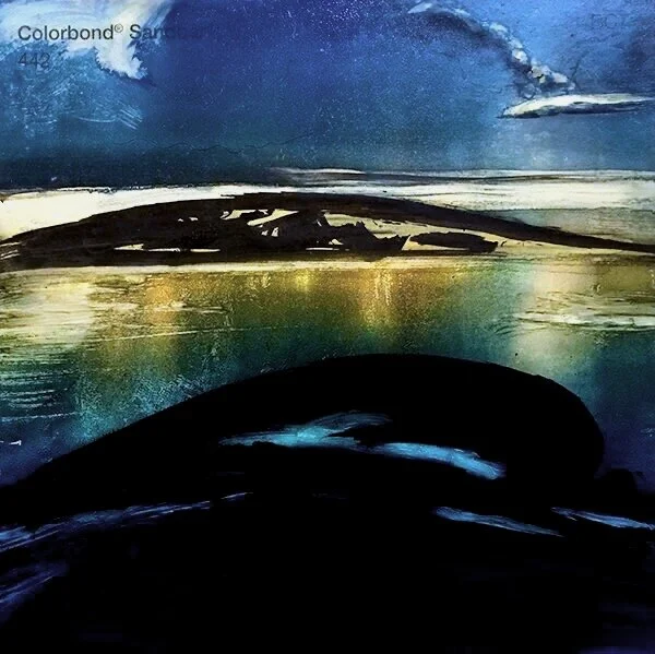 They are all painted on colour chart sample cards. The four corner panels are unpainted with the names of the samples still visible. They are “Original Canvas” (top left), “By Design” (top right), ”White Comfort” (bottom left) and “White Disclosure”(bottom right). These were chosen because of their relevance to the subject of the work which is the representation of just a few of the many massacre sites throughout Australia since colonisation. By having the corners blank the remainder of the images form a cross, The taking of the land was seemingly with God’s benediction.