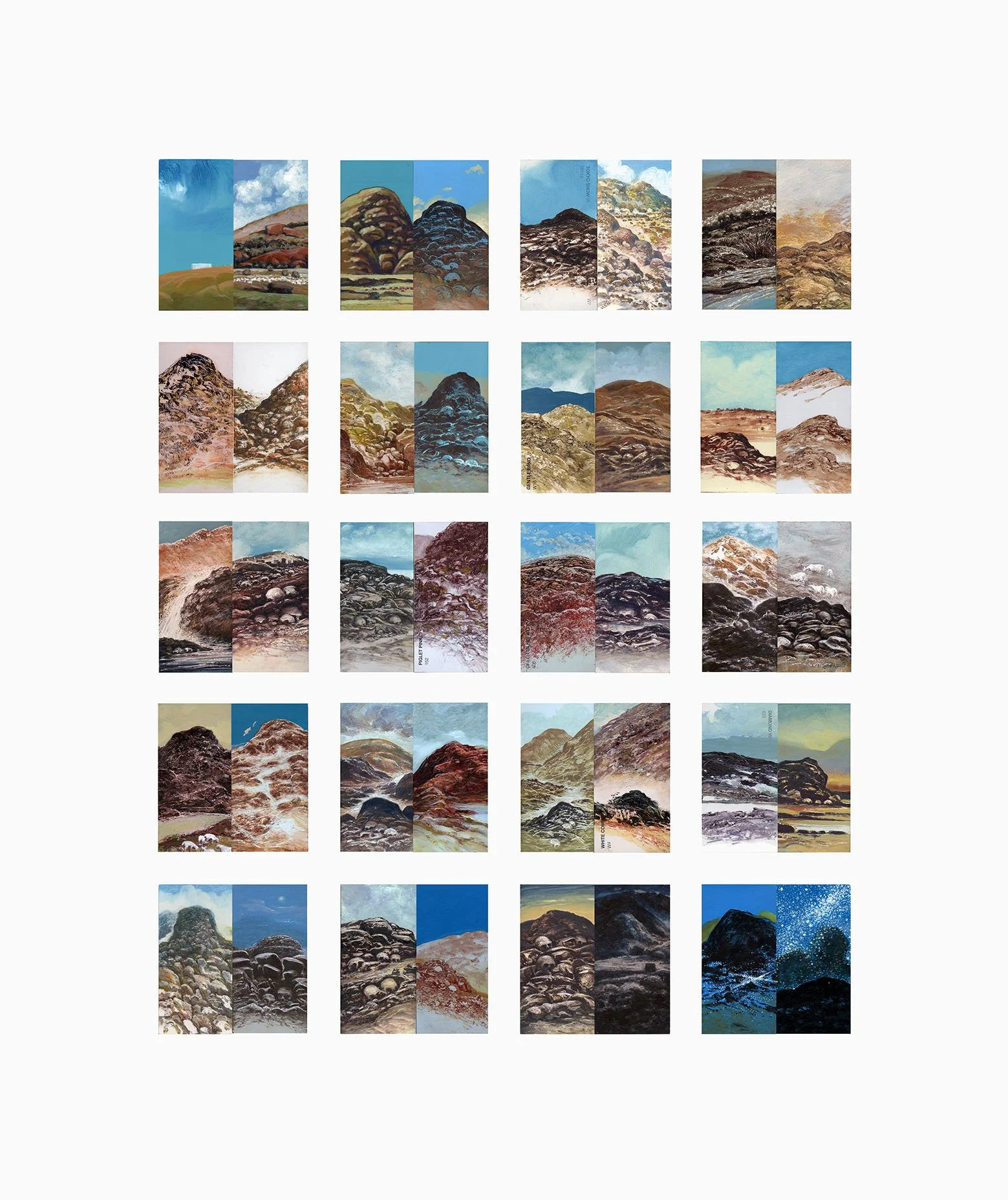 This work revisits the massacres of indigenous people in Australia. It was created in 2020, the working title being “2020 Vision", a comment on how we can look back and clearly see the magnitude of damage done to the indigenous owners of the land. There are 20 images of landscape and 20 images of landscape with human skulls and bones. The top left image shows the roof of a single western style abode in daylight. The bottom right shows an established country town at night. In between are images of sheep, cattle and goats grazing among the remnants of human skeletons. To date, we still haven’t had any official acknowledgement or revelations of the scale of the violence committed against Aboriginal people.